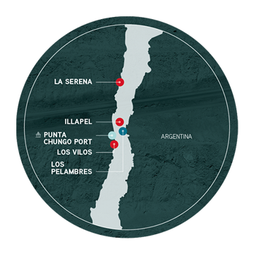 Los Pelambres is a sulphide deposit in Chile’s Coquimbo Region, 240 km north of Santiago. It produces copper concentrate (containing gold and silver) and molybdenum concentrate through a milling and flotation process.